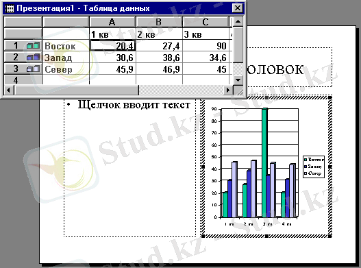 Слайдқа Excel программасында құрылған дайын диаграмманы буферге көшіріп алып, енгізуге де болады. Ол үшін Excel программасында қажетті диаграмманы ерекшелеп, Түзету - Көшіру (Правка - Копировать) командасын орындау арқылы, буферге аламыз. Power Poіnt программасына оралып, Түзету - Енгізу (Правка - Вставить) немесе жанама менюдегі Енгізу командасын орындаймыз.