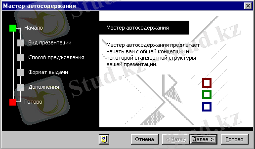 Осы сұрақтардың бәріне жауап алғаннан кейін автомазмұн шебері презентацияны дайындайды. Тиісті мәліметтерді енгізгеннен кейін Дайын (Готово) батырмасын шертеміз.