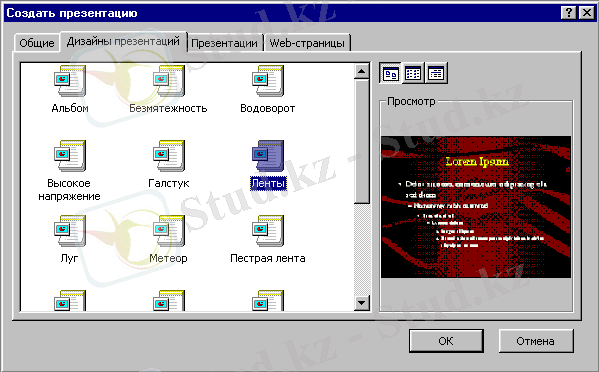 Файл - Құру командасын орындағанда ашылған сұқбат терезені Жалпы (Общие) астарлы бетінде Жаңа презентацияны (Новую презентацию) шарт белгісін таңдау арқылы;