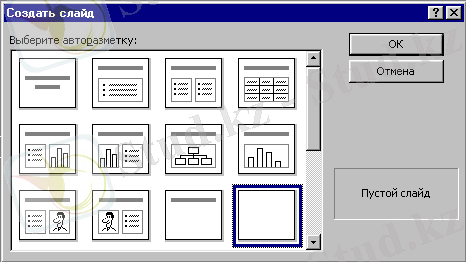 Power Poіnt программасында слайдтар белгіленуінің 24 түрлі варианты бар. Осы варианттар ішінен өзімізге қажеттісін таңдаған соң ОК батырмасын шертеміз.