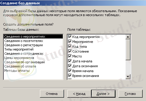 мәліметтер қорының кестелер тізімі, ал екіншісі - таңдалынған кестенің өрістері тізімі. Бұл тізімде кестеге қосылатын өрістер белгіленген. Көбінесе кестенің барлығы дерлік, сирек қолданылатындарынан басқа өрістері белгіленген. Өрістер үшін жалаушаларды орнықтырып немесе алып тастап, кестенің өрісін таңдай аламыз. Кесте өрісін таңдап алған соң Әрі қарай батырмасын шертеміз.