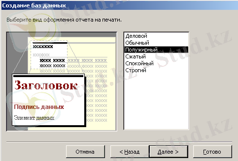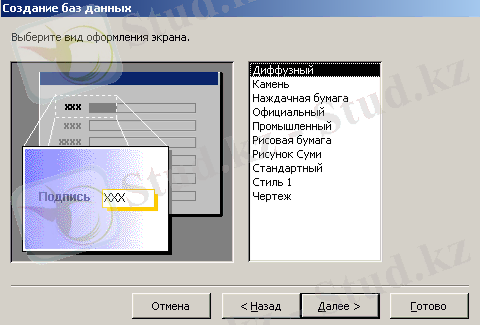 Дайын батырмасын басқан соң шебер, өзіміз берген өрістермен енгізуімізді, қарапайым пішін мен информацияны қарауды, сонымен қатар қарапайым есептерде тұратын мәліметтер қорын жасауға көшеді. Мәліметтер қорын жасау барысынан кейін дайын мәліметтер қорын пайдаланамыз: кестеге мәліметтерді енгізу, оларды қарау және баспадан шығару.