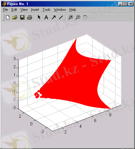 Мұнда flow (ағын) үш өлшемді фигурасының графигі тұрғызылады. Ол өз нүктелерінің x, y, z үш массивпен және AlphaData классты қосымша v массивімен берілген. Бірінші тұрғызылымда жарықты өткізу қасиеті жоқ және тұрғызылған фигура төмендегі суретте көрсетілген түрге ие болады: