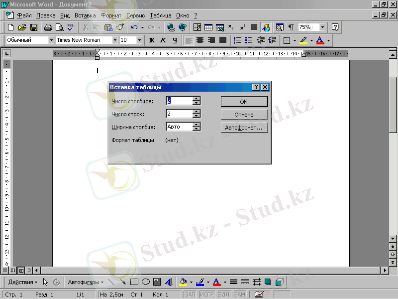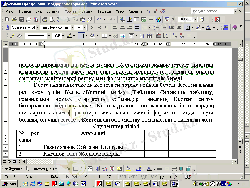 Текстің курсормен көрсетілген жерінде қажетті өлшемдегі кесте пайда болады. Кестені енгізу батырмасының көмегімен кестені құру барысында бағаналар ені мен бағаналар саны негізінде автоматты түрде анықталады. Ал егер кесте құру процесінде бағаналар енін өзіңіз санмен аныктағыңыз келсе, онда Кесте⇒Кестені енгізу командасын пайдаланғаныңыз жөн.