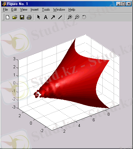 Мұнда flow (ағын) үш өлшемді фигурасының графигі тұрғызылады. Ол өз нүктелерінің x, y, z үш массивпен және AlphaData классты қосымша v массивімен берілген. Бірінші тұрғызылымда жарықты өткізу қасиеті жоқ және тұрғызылған фигура төмендегі суретте көрсетілген түрге ие болады: