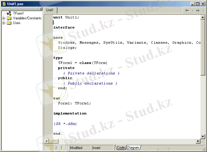 Біздің негізгі қарастыратын файлымыз - модуль файлы. Бұл файлдың да жазуы Object Pascal тілінің синтассисімен жазылады. Модуль файлы - ол программаның жеке бөліктерін (фрагменттерін) жазатын файл. Осы файлдың құрылысын терең қарастырайық.