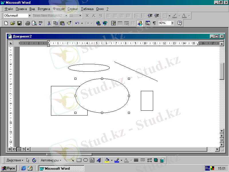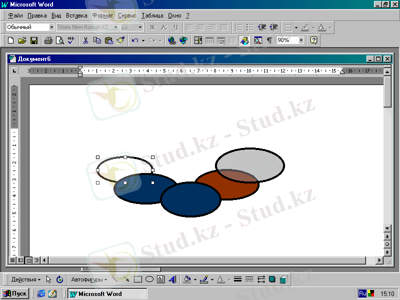 Егер графиктік элементтер бір-бірін жауып тұратын болса (19. 5-сурет), қай элементтің беткі жағында (устінде), ал қайсысының астыңғы жағында орналасуы керектігін анықтап кµрсету мүмкіндігі бар. Бұл үшін қажетті элементті белгілеп алып, Үстінде орналастыру (поместить наверх) немесе Астында орналастыру (Поместить назад) батырмасын басу қажет.