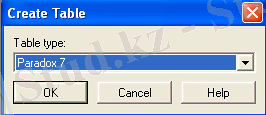 Жаңа кестені құру келесі команда бойынша іске асады: Пуск\Программы\Borland Delphi7\Database Desktop. DBD кірген мезетте жұмыс істейтін каталогты таңдап алу керек. Ол үшін DBD менюінде File\Working Directory және көрсетілген терезеден С:\Бакыт каталогына сілтеме жасаймыз. Менің жағдайымда Depozit кестесін құру үшін File\New\Table. DBD Create Table терезесін шығарады, оның форматын таңдап алу керек.