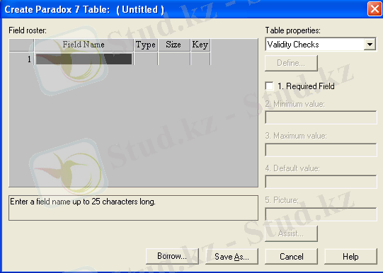 Құрылып жатқан кестенің әрбір өрісіне бір жазба сәйкес келеді. Field Name бағанына өріс атын, Type - символ, өрісте сақталынатын мәліметтердің типін анықтайды. Size бағанына - сан қойылады, өрістің ұзындығын анықтайды, Key-«*» символы, егер бұл өріс бойынша біріншілік кілт қою керек болса.