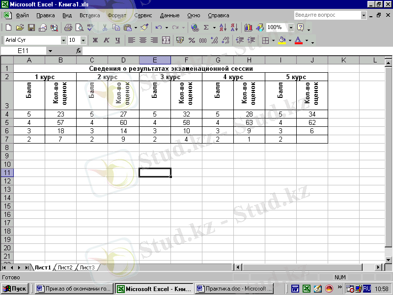 Сурет8. « кесте орналастыруы « мәлімдеудің емтихандық сессия нәтижелері туралы » жұмысшы үстелде нәтижелерді MS Exel сессиялары »