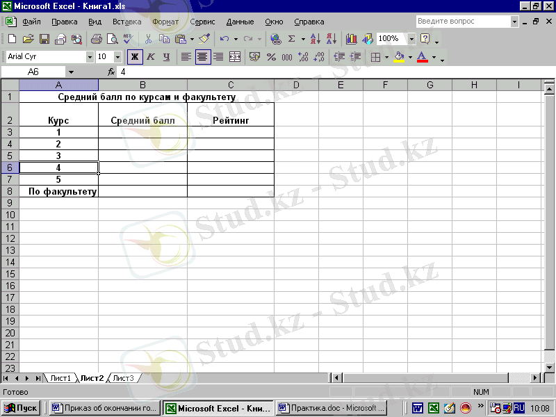 - MS Exel орташа балы парағында курс және факультет бойынша орташа балының таблицасын құрамыз