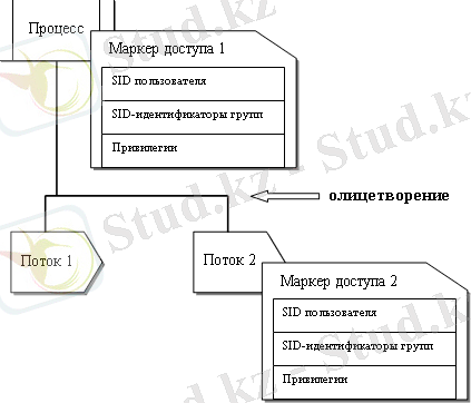 Жүйеде жұмыс жасайтын барлық ағымдар мен үдерістер қолданушының контекстік қорғауымен орындалады, оны қолданушы өзі енгізеді. Үдерісті немесе ағымды объект пайдалана отырып, қорғау контекстін идентификациялау үшін қатынас құру маркері(access token) деп аталатын объекті қолданылады. Қорғау контекстіне ағыммен және үдеріспен салыстырылған топтар, тізім атаулары, артықшылықтары жайлы ақпарат жатады. Тіркеу үдерісі кезінде жүйеде қолданушыны таныстыратын бастапқы маркер құрылады, және оны қолданушы тіркеуі үшін қоланылатын үдеріс сыртымен салыстырады. Қолданушымен орнатылған барлық программалар осы маркер көшірмесіне ие болады. Windows операциондық жүйесінде қорғау механизмдері үдеріске немесе ағымға рұқсат етілген әрекеттер жиынын анықтай отырып, маркерді қолданылады. Маркер негізгі немесе кейіптеулі болу мүмкін(қолданушының контекстік қорғау ағымына уақытша алмасу үшін қолданылады) . Кейіптеулі(inpersonation) - Windows қорғау моделінде қолданылатын механизм, ол контекстік қорғауда жеке ағымға орындалуға мүмкіндік береді. Кейіптеуді бейнелеу қызметі келесі суретте көрсетілген.