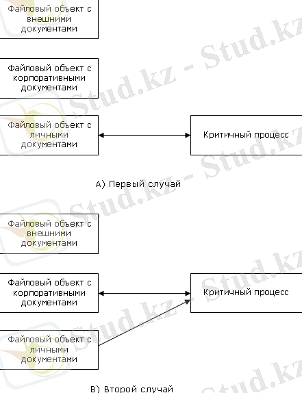 4-суретте көрсетілген сұлбалар ерекшелігі, бірінші жағдайда критикалық үдеріспен қолданушылардың мәліметтерді қорғау объектілеріне қатынас жоқ, екінші жағдайда - тек қана оқу мүмкіндігі бар( сәйкес жағдайда қатынас құру құқығы беріледі) . Өңдеу сұлбасын таңдау критикалық үдерістің функциялары қандай және ақпараттың санкцияланбаған түсінігіне нені жатқызамыз сонымен анықталады. [1, 3]