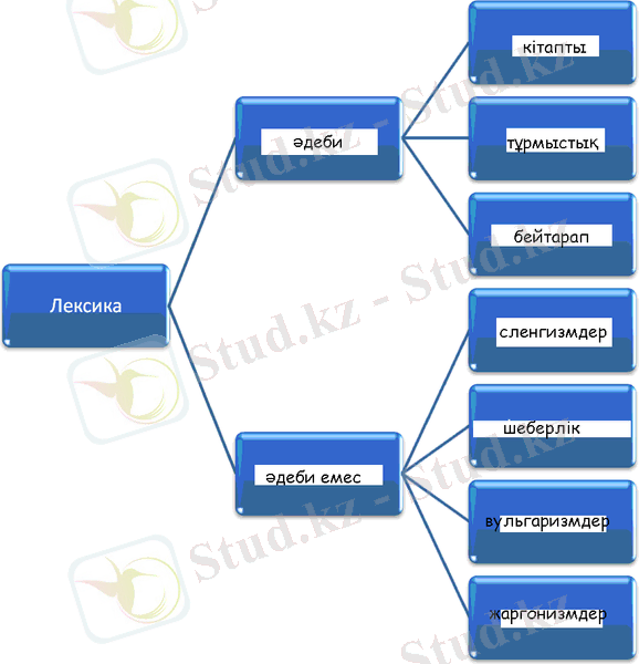 Кез-келген тілдің лексикасын үлкен екі бөлікке бөлуге болады: әдеби және әдеби емес. Кітаптық лексика, тұрмыстық лексика және бейтарап лексика лексиканың әдеби бөлігіне жатады. Ал сленгизмдер, вульгаризм, профессионализм және жаргонизмдер лексиканың әдеби емес бөлігіне жатады.