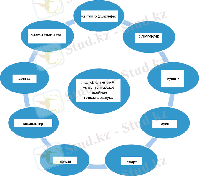 Синхронды тілде біз жастар сленгісін өзіндік лексикамен толықтыратын жастардың ортасын жасырамыз. Оған келесілер жатады:
