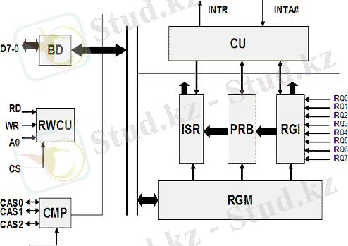 RWCU - жазу\ оқу басқару; микропроцессордан басқару сигналдарын қабылдайды және үзіліс контроллерінін функционалды режимін береді.