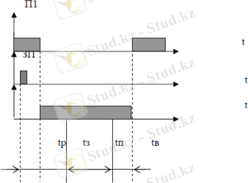 5. 1 суретте жүріп жатқан П1 бағдарламасының уақытылы үзу диаграммасы көрсетілген. Үзу туралы ұсыныс түскенде (3П) процессор үзуші бағдарламаға бірден кіріспейді П2, яғни үзу туралы ұсынысқа жүйе анализ жасауға біршама уақыт кетеді. П2 Үзуші бағдарлама іске кіріскеннен кейін, үзілген бағдарламаның күйін еста сақтау үшін tз уақыт өтеді, ал одан кейін tп уақыт аралығында үзуші бағдарлама жұмыс істейді. Содан кейін бірден tв уақыт ішінде үзілген бағдарламаның жай күйі қалыпқа келтіріледі және оған басқару беріледі. Үзілген бағдарламаның қалыпқа келтірілген жай күйін есте сақтауға П1 және оған қайтып келетін уақытты бағдарламаға қызмет көрсету уақыты деп атайды. Жауап қайтару уақыты tp кызмет ету tо=tз+tв үзу процессын ұйымдастыру барысында машинаның қанша уақыт жоғалтқанын мінездейді және ЭЕМ үзу ұсынысына қызмет ету жылдамдығын білдіреді.