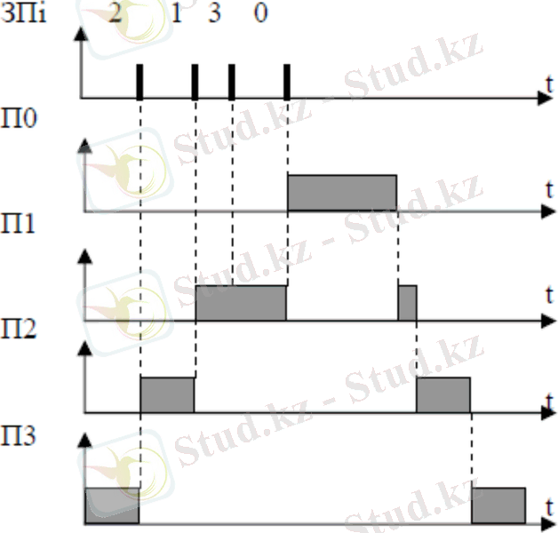 Бірінші деңгейдің үзілулері екінші және үшінші деңгейдің бағдарламаларын үзе алады, бірақ нөлдік деңгейдегі бағдарламаларды үзе алмайды. Уақытша диаграммада (сур. 5. 2) 3Пi сұранысының олардың деңгейіне байланысты көрсетілген.