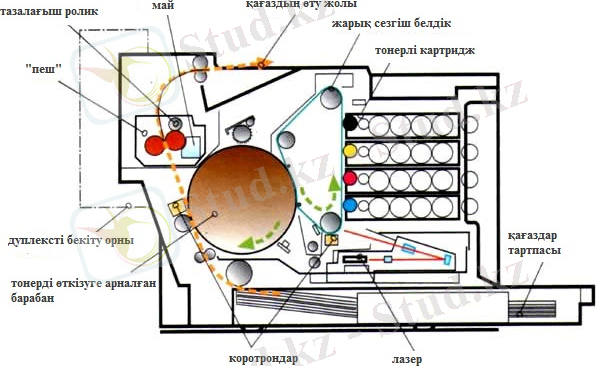 - Струйный принтерлер жоғары сапалы басылымды қамтамасыз етеді. Олар әсіресе түрлі-түсті графикалық бейнелерді басып шығаруда қолданады. Түрлі сияларды қолдану салыстырмалы қымбат емес, жақсы сапалы бейне алуға мүмкіндік береді. Түрлі-түсті модельіCMYB(Cyan-Magenta-Yellow-Black) негізгі түстер атымен, бояу тақтайша құрайтындар. (политра)