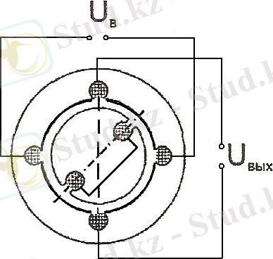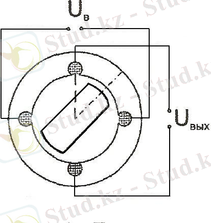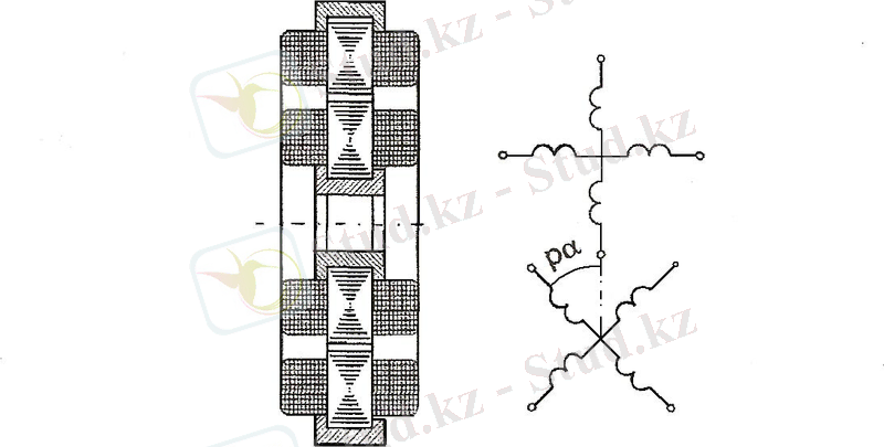в) Роторда орамы жоқ бұрыш датчигі. Датчиктің принципиалды сұлбасы 1. 3-суретте көрсетілген. Датчиктің статорында, осьтері 90 электрлі градусқа араласқан екі орам орналасады. Орамның бірі - қоздыру орамы, екіншісі - шығыс. Ротор айқынполюсті және статор орамы секілді сондай полюстердің пар санынан тұрады. Датчиктің шығыс орамында полюстердің осімен Э. Қ. К осінің сәйкес келуі нөлге тең. Бұл бұрыш 45 электрлі градусқа тең болған кезде, Э. Қ. К-і максималды мәнді иеленеді.