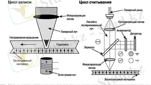 Дискке жазу диск ұяшығының интенсивтілігі жоғары лазердің t=200 С о дейінгі қызуымен жүзеге асырылады, нәтижесінде ұяшық зарядын жоғалтады. Есептеу интенсивтілігі төмен лазерлік сәулемен жүзеге асырылды. Ол ұяшыққа бағытталып сол зерде зарядпен полярланады, ал есептеуіш құрылғы берілген сәуленің полярланғандығын анықтайды.