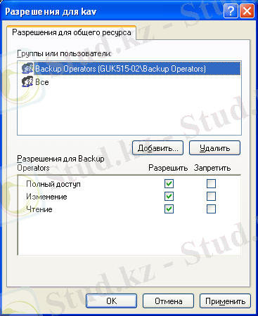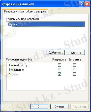 Терезеге қайтып оралып (сурет 1. 5в), Ок батырмасын басып, соңғы нәтижеге шығамыз (сурет 1. 6) . Рұқсат терезесінде топтың әр мүшесіне папкаға қатынас типін рәсімдейміз. Егер олардың барлығы тең құқықты болса, онда деректерді осы папка файлына енгізу керек, немесе папкаға толық қатынас құруға рұқсат беріледі.
