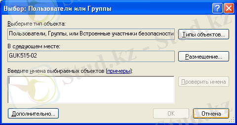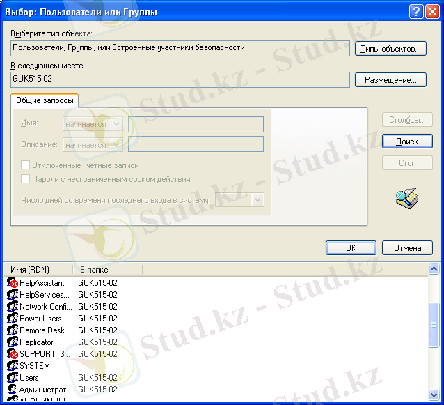 Келесі кезең - рұқсат беру ( Рұқсат батырмасын басу қажет - сурет 1. 5а) . Пайда болған терезеден (1. 5б сурет) Барлығы тобын ( Жою батырмасы) жойып, Қосу батырмасының көмегімен өз тобыңызды ұйымдастыруға көшу. Таңдау терезесінде (сурет 1. 5в) Обьектілер типтері батырмасымен Қолданушылар типі таңдалады. Егер қолданушылардың желілік аттарын білетін болсақ, онда сол сәтте оларды енгізе аламыз [таңдалатын обьектілердің аттарын енгізіңіз (мысалдар) ] . Егер күдік болса, Қосымша батырмасымен таңдау (сурет 1. 5г) терезесін ашып, ондағы Іздеу батырмасын басамыз да, тізімнен қажетті желілік аттарды іздейміз. Топтап белгілегеннен кейін Ок батырмасының көмегімен, папкаға рұқсат етілген тұлғалар тізімге қосылады.