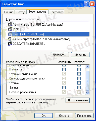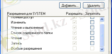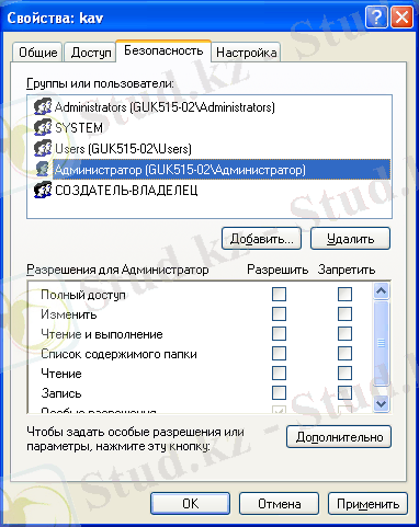 Қауіпсіздік терезесінде қолданушылар тізімін басқару жоғарыда баяндалған желілік қатынастағыға ұқсас. Тізімнен тандалған әр қолданушы үшін администратор (егесі) дербес рұқсат пен тыйымдар орната алады, ол үшін рұқсат немесе тыйым салу жалаушаларын қолданады. Қолданушының папкаға немесе файлға қатынастарының барлық түріне тыйым салған кезде Толық қатынасқа тыйым опциясын (жалауша) орнату жектілікті. Тыйымның қалған (ерекше рұқсат болмаса. . ) жалаушалары автоматты түрде орнатылады. Осы сәттен бастап папкалар мен файлдар құрамына қол жеткізу мүмкін болмай қалады (сурет 1. 9)