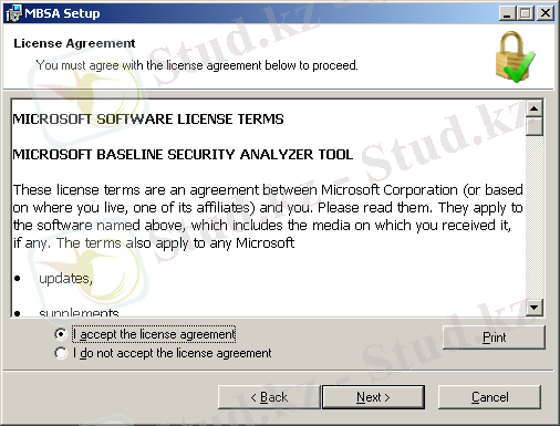 www. microsoft. com/technet/security/tools/mbsahome. asp. Осы беттен MBSASetup-EN. msi файлын іске қосу керек. Microsoft Baseline Security Analyzer-ді орнату үшін MBSASetup-EN. msi файлын сақтағаннан кейін, осы файлды жұмысқа қосу қажет, онан соң қолдану шарттарымен келісімді тұжырымдап (2. 1 сурет), орнату шеберінің нұсқаулары бойынша әрі қарай орнату прцесін жалғастыру қажет.