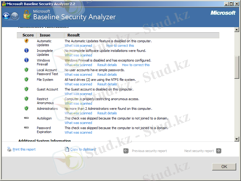 Екінші кезеңде - MS Baseline Security Analyzer көмегімен қауіпсіздікті тестілеу.