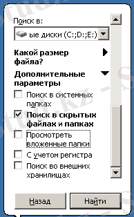 Жүйелік администратор өзінің ерекше аты бар және сәйкес қатынас құру паролі бар қолданушыны тіркейді. Осы атпен және парольмен компьютерге кіруге тәжірибелі қолданушы құқығын иемденген қолданушы жүйеде еркін жұмыс істей алады, деректерді жасыру мүмкіндігін орнатуға өзгерістер енгізе алатын болады (өзіне берілген мүмкіндіктердің көлемінде) . Жүйелік администратор әдетте тәжірибелі қолданушыға барлық дискілердегі кең ауқымды құқықты бермейді, тек қорғауға жататын деректер орналасқан дискіге қол жеткізу мүмкіндігін береді. Дегенмен кез келген қолданушы (жасырын файлдарды сақтаудың логикалық облыстарымен қол жеткізе алатын құқығы бар) “Жасырын файлдар мен папкаларда іздеу” жалаушасы іздеудің қосымша параметрлерінде орнатылған болса, іздеу терезесіндегі соңғы өзгерістерді қөре алады (сурет 1. 3) .