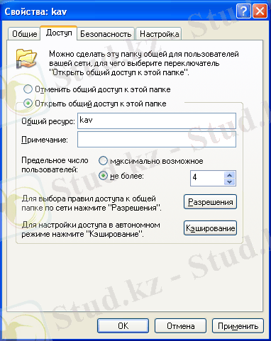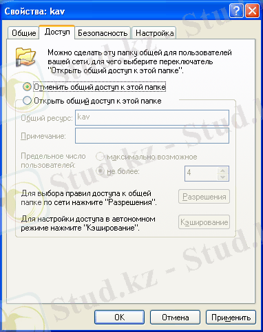 Біріншіден, өте қажет болмаса, сәйкес деректі папкаға жалпы желілік қатынас құру мүмкіндігін ашпау керек (сурет 1. 4), қарсы жағдайда желінің кез келген жұмыс станциясынан бұл папка осы станцияның жұмысына жіберілген барлық қолданушыларға көрініп тұратын болады.