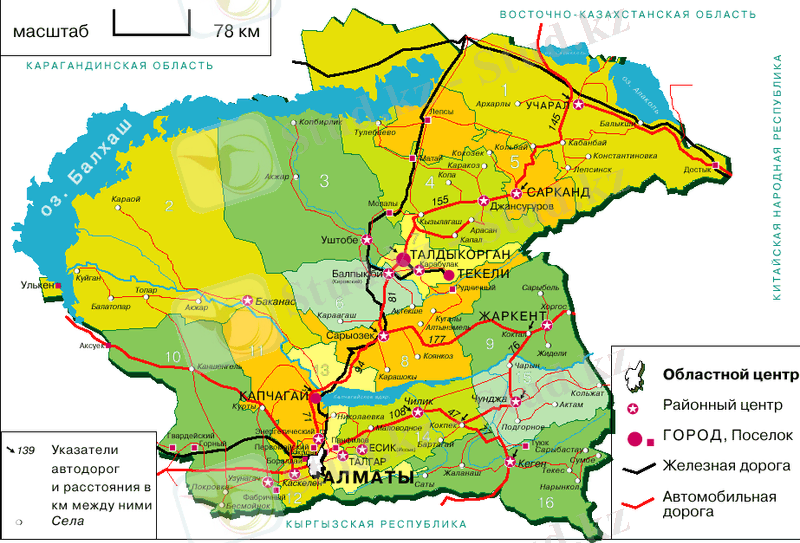 Ауылдық кенттік және қалалық округтер саны - 274, халқының тығыздығы - 7 адам/шаршы км. Астана қаласына дейінгі қашықтық - 1480 км. Облыс республиканың оңтүстік-шығысында орналасқан, шығысында Қытаймен, оңтүстігінде Қырғыз республикасымен, солтүстік-шығысында және солтүстік-батысында - Балқаш көлімен, батысында - Жамбыл облысымен шектесіп жатыр. Облыста 16 аудан (1-кесте), облыстық бағыныстағы 3 қала бар. Барлық 274 әкімдік, олардың ішінде 16 аудандық, 10 қалалық, 14 кенттік, 234 ауылдық әкімдіктер бар.