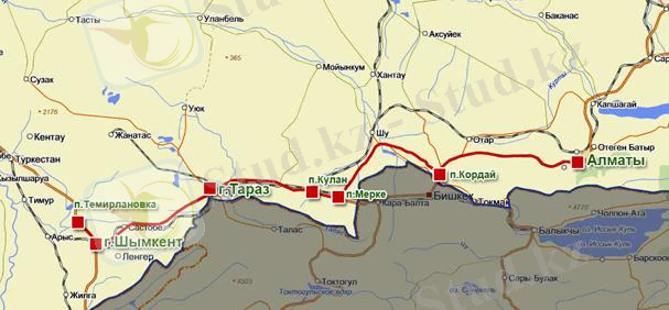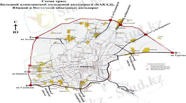 Егер Қазақстан автомобиль жолдарының жалпы ұзындығы жөнінен ТМД елдерінің арасында үшінші орында тұрса, жолдың жиілігі жөнінен ең соңғы орындардың бірінде. Сондай-ақ Алматы-Бішкек-Тараз-Шымкент-Ташкент (3-сурет) жолы Қазақстандағы ірі республикалық деңгейдегі автомобиль жолдарының бірі болып табылады. Алматыдан Семей мен Өскеменге бағытталған жол Жаркент, Талдықорған және Текеліге қарай тармақталады. Жалғызтөбе теміржол станциясы маңында бұл жол Шығыс шеңбері автомобиль жолымен жалғасады. Сонымен қатар Алматы-Шелек-Нарынқол және т. б. ірілі-ұсақты жолдардың шаруашылық үшін маңызы зор.
