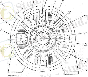 Сурет 2 Тұрақты ток электр қозғалтқышының құрылысы: 1 - станина, 2 - негізгі полюс, 3 - қоздыру орамасы, 4 - полюсті ұштамасы, 5 - қосымша полюс, 6 - қосымша полюс орамасы, 7 - компенсациялы орама өткізгіштері, 8 - әуелік қуыс, 9 - якорьдің магнит өткізгіштері, 10 - якорь орамасының өткізгіштері, 11 - щетка, 12 - білік, 13 - коллектор, 14 - шеңгел.
