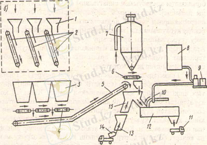 толықтырғыштары қоректендіргіштерден (1) тасымалдағыштармен (2) шанақтарға (3) беріледі, одан дәлмөлшерлегіштер (4) арқылы тасымалдағыштаг мен (5) таратқыштарға (15) түсіріледі. Цемент тарату шанағынан (1) өз ағымымен цемент дәлмөлшерлегішіне 6, одан ары тараткышқа (15) түсіріледі.