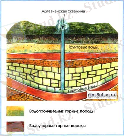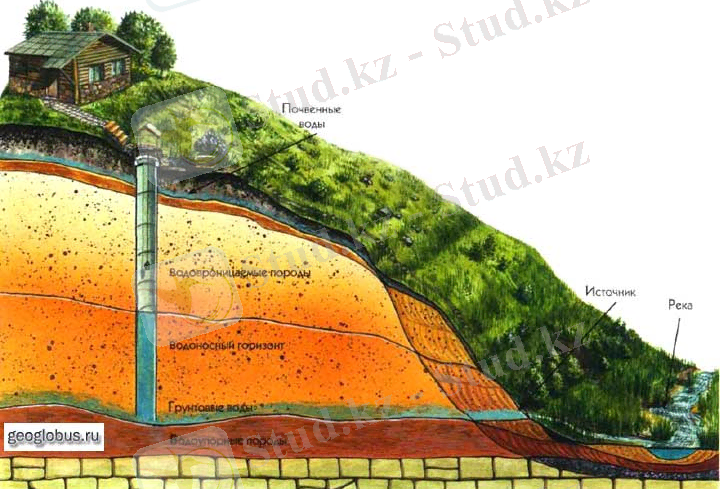 Суреттен көріп отырғанымыздай жер асты көрінісі берілген. Яғни, ең жоғарғы қабат - топырақты су қабаты, екінші қабат - су өткізуші қабаты, үшінші қабаты - сулы қабат, одан төменірек- грунт су, соңғысы - су тіректі тау жыныстар. Бұл жер асты сулары ары қарай бастау арұылы өзенге ұласады.