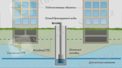 Су деңгейін азайту - жер асты суларының қысымы мен деңгейін арнайы дренаждық құрылғы көмегімен төментету. Бұл көбіне құрылыс жұмыстары кезінде, шахта мен карьерлерде эксплуатациялау басталғанда, жер асты сулар деңгейін статикалық қорды өңдеуін күшейту және динамикалық ағысты тоқтату арқылы интенсивті төмендету арқылы жүргізеді. Бұндай жұмыстар жұмыс алаңында арнайы су төмендеткіш ұңғыма ( кейде озық дренажды және инесүзгілі құрылғымен қосып) көмегімен жасайды. Су деңгейін төмендеткіш ұңғыма: сүзгі, суды айдауға арналған сораптан, автоматты басқару батырмасынан тұрады және суды айдау үшін коллектормен жалғайды.