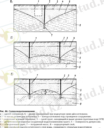 Су деңгейін төмендету үшін: ине сүзгілі құрылғы, сорғыш ине сүзгісі, вакуумды су төмендеткіш, су төмендеткіш ұңғымада орналасқан тереңдік сорап әдісі қолданылады. Бұл әдістің негігі ерекшелігі - грунт суын ұңғыма мен құдықтарға айдаған кезде, оның жоғарғы жағы белгілі бір бұрыш жасай оймалы формаға айналады (воронкалы) . Воронка формалы бетті - депрессиялы бет, ал олардың аралық қабатын - депрессиялы воронка деп атайды. (сур. 86)