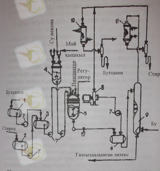 1, 2 жинағыш, 3 смеситель, 4 эмульгатор дайындауға арналған аппарат , 5-полимеризатор; 6 латекс жинағыш; 7-8-компрессор, 9-отпарная колонна, 10, 11 - конденсатор, 12-дроссельный вентиль