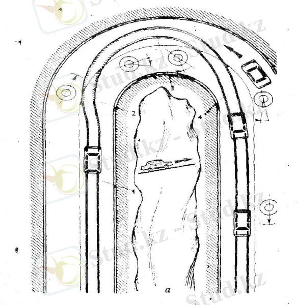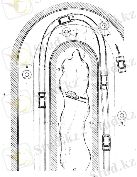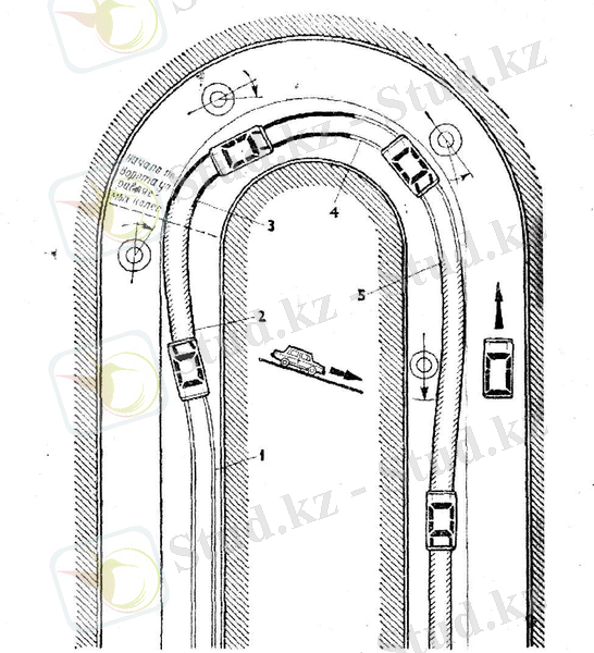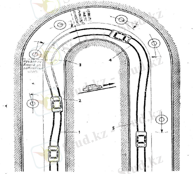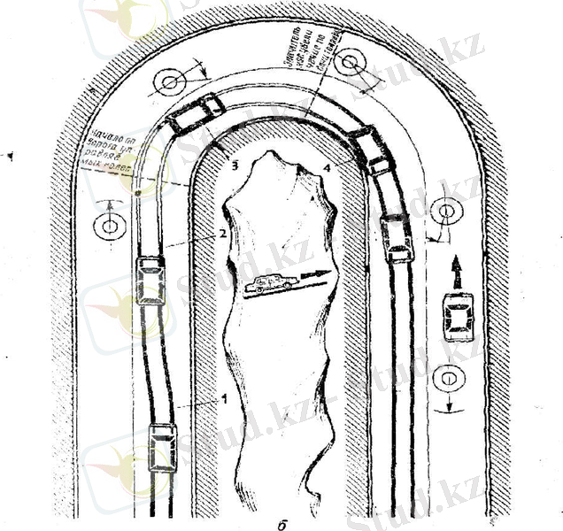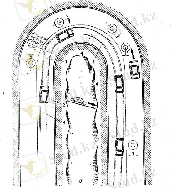 <h4>96 суретте а- дұрыс емес шектелген шолуы бар серпантинмен төмен қарай түсу: 1 - жүргізуші тек газды азайта отырып, серпантинге тежелмей келеді, 2 - жылдамдық шамалы азайғанын көріп, ол тормозға басады, бірақ тым кеш; көлік қарама қарсы қозғалыс жаққа қарай шығып кетеді; 3- қосымша рульді оңға қарай бұру арқылы ол бұрынға өзінің қозғалыс жолына түскісі келеді, бірақ жақтық инерциялық күш оған қарысылық білдіреді. 4- отынды көбейе, азайта отырып, ол қарама қарсы кездесетін көлікке дейін қауіпті зонадан кетуге үлгереді. </h4>