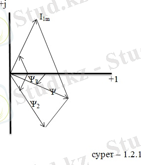 Демек, і- тогының I m - амплитудасы, ѱ - бастапқы фазасын анықтау қажет. Осыған сәйкес комплекстік жазықтықта -тогын І 1m = І 1m e jѱ 1 , ал і 2 -тогын І 2m = І 2m e jѱ 2 векториар түрінде бейнелейміз. І 1m және І 2m - векторларының геометрриялық қосындылары І m = І m e jѱ қосынды, токтың комплекстік амплитудасын береді. Токтың І m - амплитудасы қосынды вектордың ұзындығы, ал бастапқы ѱ - фазасыосы вектор мен +1 өсінің арасындағы бұрыш ретінде анықталады .