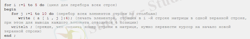 Для последовательного ввода элементов одномерного массива мы использовали цикл for, в котором изменяли значение индекса с 1-го до последнего. Но положение элемента в двумерном массиве Паскаля определяется двумя индексами: номером строки и номером столбца. Это значит, что нам нужно будет последовательно изменять номер строки с 1-й до последней и в каждой строке перебирать элементы столбцов с 1-го до последнего. Значит, нам потребуется два цикла for, причем один из них будет вложен в другой.