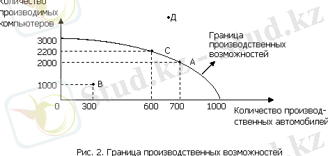 Точки на границе производственных возможностей отражают эффективный уровень производства. Точка В отражает неэффективное функционирование экономики. Точка Д указывает объем производства, которого мы никогда не сможем добиться в силу ограниченности имеющихся ресурсов.