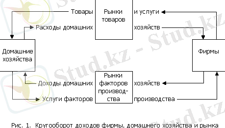 Выходящий из сектора домашних хозяйств поток представляет собой сумму платежей за товары Сумма платежей за товары, получаемых фирмами, равна общему объему продаж товаров в тенге Управление потоками факторов и товаров осуществляется посредством рынков (рынки товаров, рынки факторов производства) .