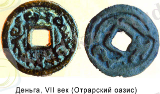 Масса китайских и согдийских монет найдена при раскопках городского рынка Отрара. VII-VIII века, время, когда города Европы приходят в упадок. На средней Сырдарье - напротив, расцветают города и торговля. Эти города начинают чеканить собственные бронзовые монеты, за образец которых берутся согдийские образцы. Но и китайское происхождение денег в регионе не было забыто в "память", о чем на монетах были квадратные отверстия.