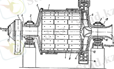 1. 2 Аппаратура технологического процессаШаровая мельница с разгрузкой посредством решетки МШР (рисунок 3) содержит: барабан, основные подшипники 2 и 3, также питатель 4. Барабан состоит из 3 частей: загрузочной, средней и разгрузочной частей. Нагрузочная доля предполагает фронтальную крышку 5, отлитую совместно с цапфой. В цапфе предусмотрен загрузочный патрубок 6, изнутри которого установлены винтообразные устремляющие для подачи материала с питателя внутрь барабана. Также патрубок предназначен для охраны внутренней поверхности цапфы от износа. Средняя часть мельницы предполагает барабан, к которому болтами закрепляются фронтальные крышки. Изнутри барабан футеруется бронеплитами 7, которые закрепляются в болтах 8. Выгрузочная доля содержит фронтальную крышку 9 с цапфой 10, выгрузочную сетку, лифтеры 12, изнутри цапфы вводится выгрузочная углубление 13. Барабан, определяемый в подшипниках 2 также 3, приобретает оборот с электродвигателя посредством зубчатого венца 14.