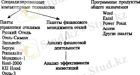 В зависимости от назначения можно выделить такие направления информационных систем гостиничного бизнеса, как программные продукты общего назначения и специализированные компьютерные технологии. А эти технологии в свою очередь можно разделить на следующие направления: пакеты управления отелями и пакеты финансового менеджмента (рис. 1. 3) .