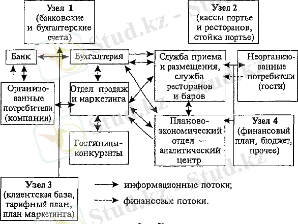 В результате движения информационных, финансовых и сервисных потоков в процессе деятельности гостиничного предприятия образуются области, где концентрация всех потоков в одинаковые моменты времени является наибольшей. Это так называемые ключевые точки или узлы наложения ресурсопотоков, которые взаимосвязаны и влияют на характеристики друг друга. Организация управленческих воздействий на потоки предпочтительна и наиболее эффективна именно в таких узлах, потому что одно управленческое воздействие может быть направлено на изменение параметров всех ресурсопотоков. Все эти узлы открыты для постоянного управленческого воздействия, и именно в них должны концентрироваться основные ресурсы управления гостиницы (рис. 1. 4) .