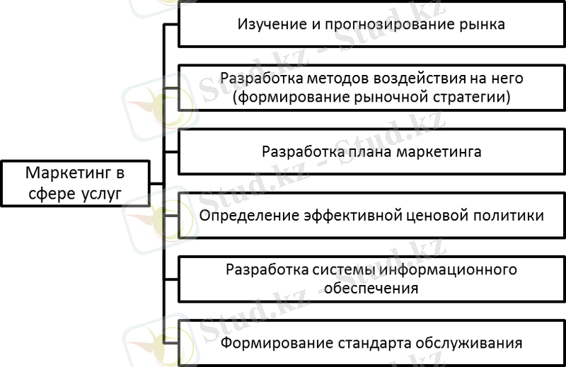 Сами по себе услуги представляют собой в некотором роде неосязаемые блага, реализуемые в форме деятельности. Их отличительными особенностями выступают неосязаемость, неспособность к хранению, непостоянство качества, неотделимость от источника и отсутствие владения. Как и любой материальный продукт они подлежат купле-продаже в условиях рынка. В общем смысле маркетинг, реализуемый в сфере услуг, может быть определен в качестве управляемого социального процесса, посредством которого индивиды и группы людей приобретают то, в чем нуждаются, обмениваясь при этом с другими созданными ценностями и продуктами. Сам по себе данный процесс включает в себя базовые компоненты маркетинг-микса. В то же время он имеет свою специфику, обусловленную в первую очередь, особенностями рынка услуг.